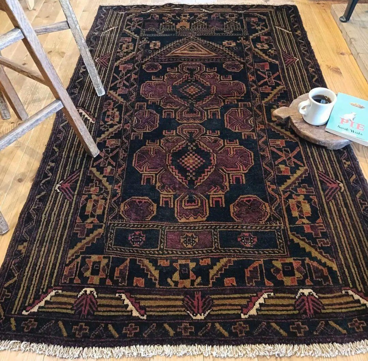 渋いカラーリングの一点もの!ブラック&パープルの模様が美しいヴィンテージアフガンラグです。送料無料でお届けいたします。