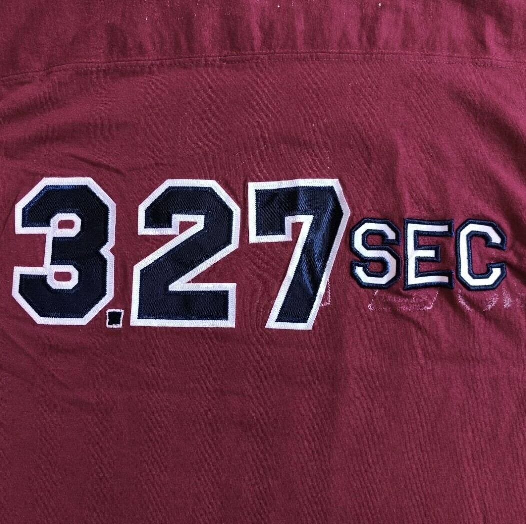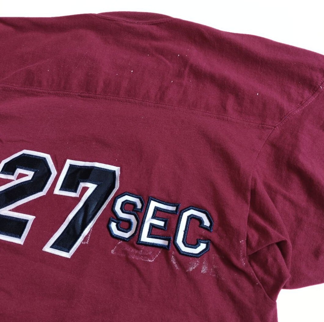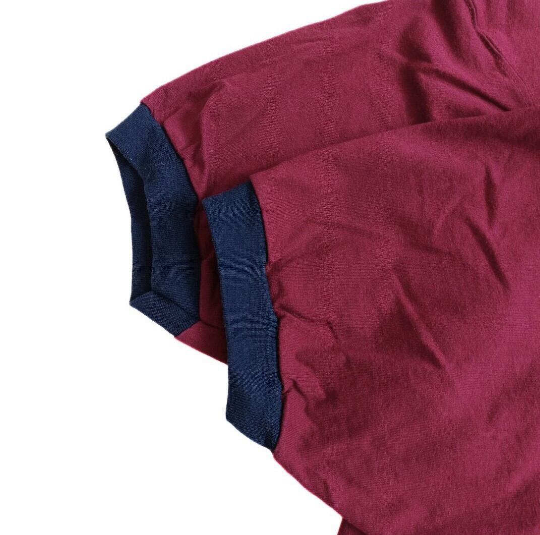 ボディはコットン100%でしっかりとした生地感。ベースのワインレッド×リブのネイビーは落ち着いた配色で、フロントとバックのビッグワッペンがアクセントになっています。