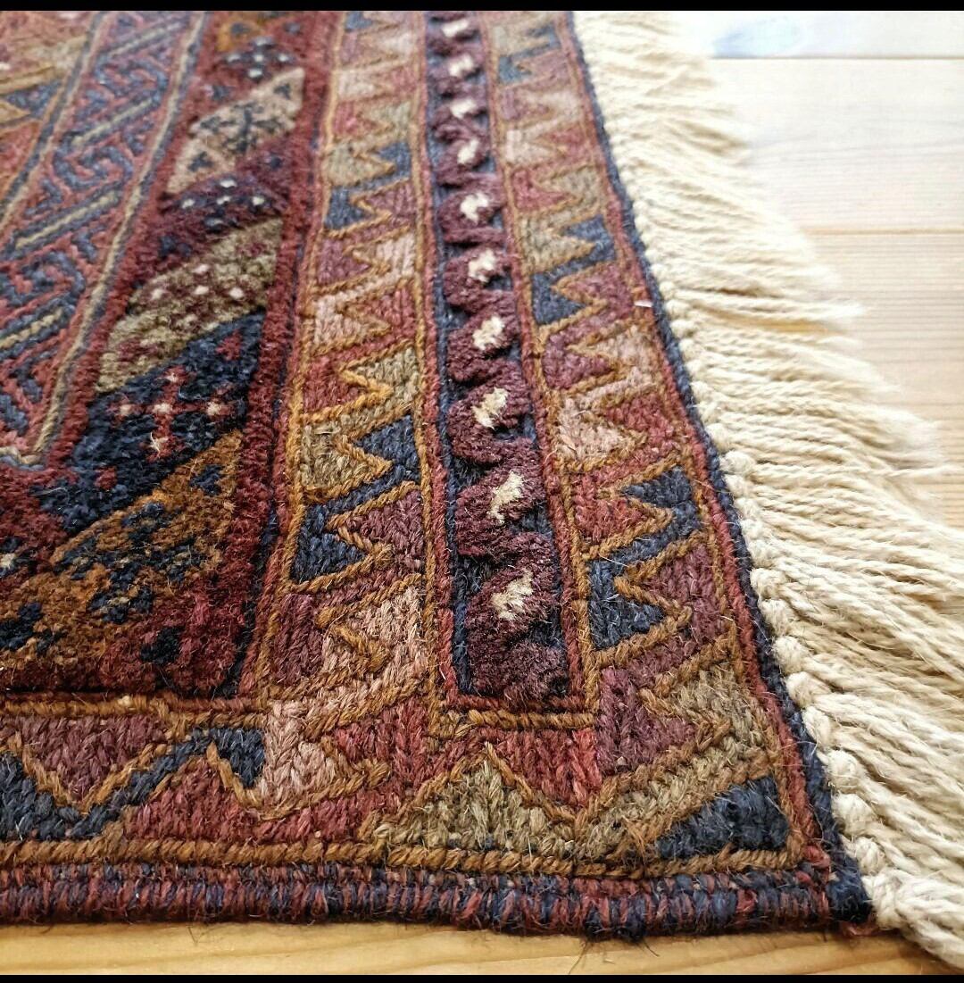 高度な“スマック織り”という技法で、毛足がなく麻のような手触りのキリム部分と、パイル地の絨毯部分があわさるため全体的に凹凸が生まれ、非常に踏み心地がよく仕上がっております。