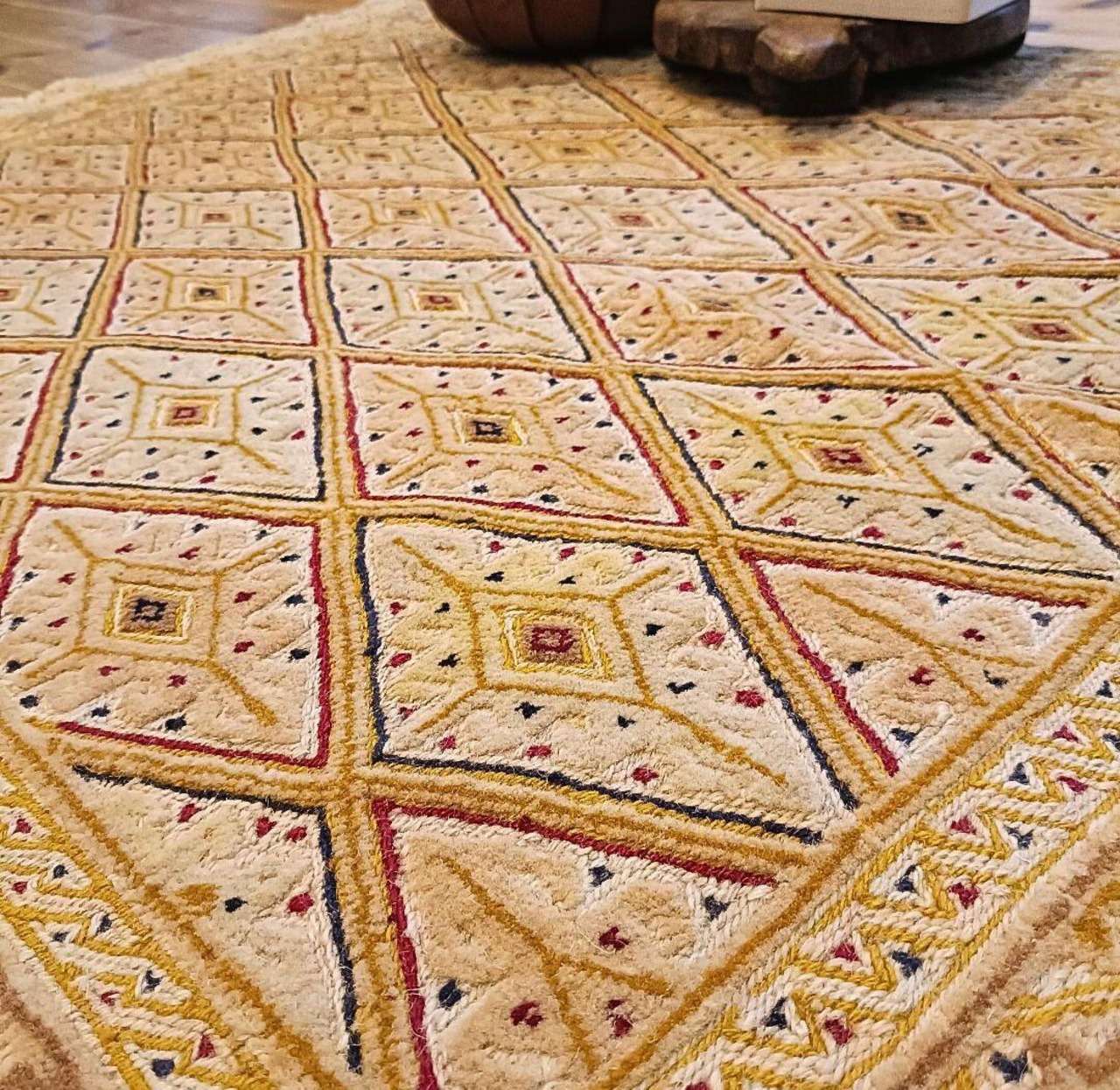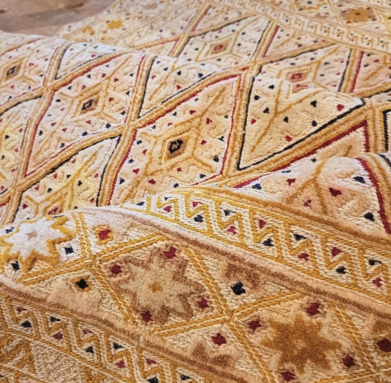 複雑で高度な“スマック織り”という技法で、毛足がなく麻のような手触りのキリム部分と、パイル地の絨毯部分があわさるため全体的に凹凸が生まれ、非常に踏み心地がよく仕上がっております。