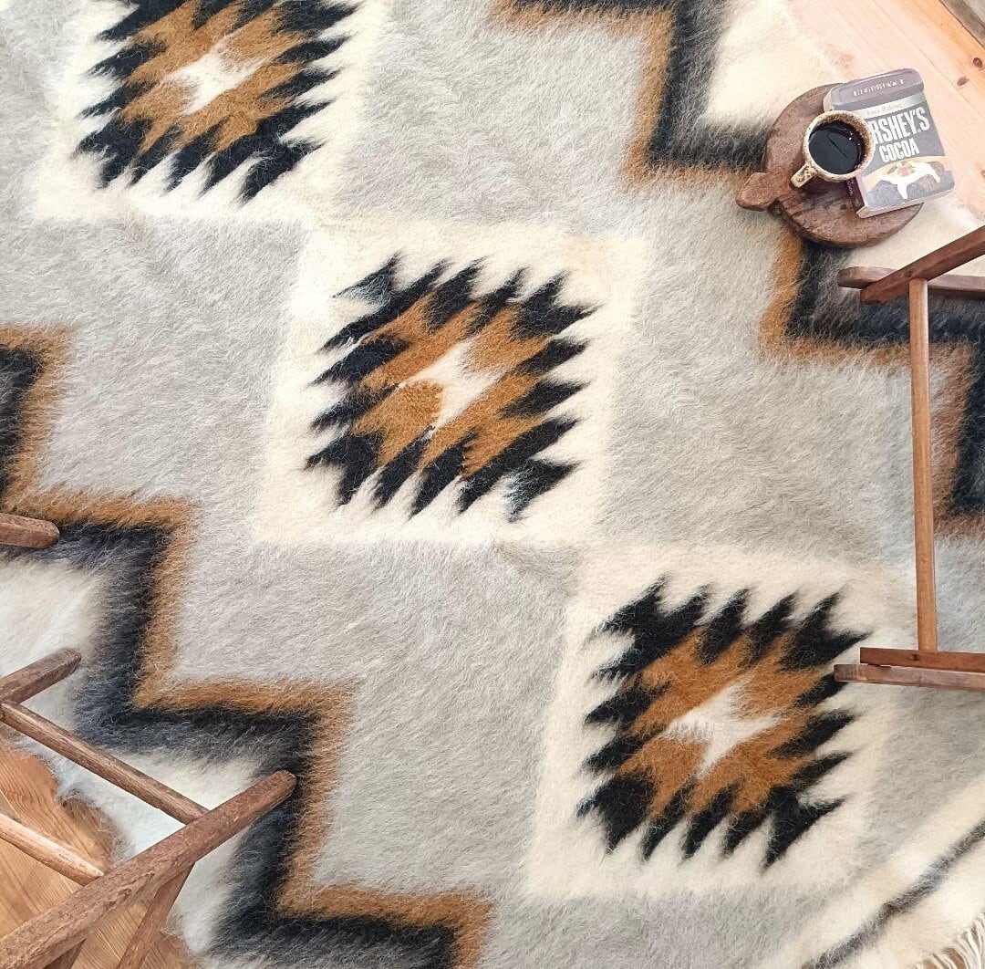 ベニワレンやトゥルラグのように毛足が長いですが、1本1本が細く繊細に紡がれている為、とても柔らかな手触りです。はじめのうちは繊維がとれることもありますが、使い込むごとに落ち着いてきます。