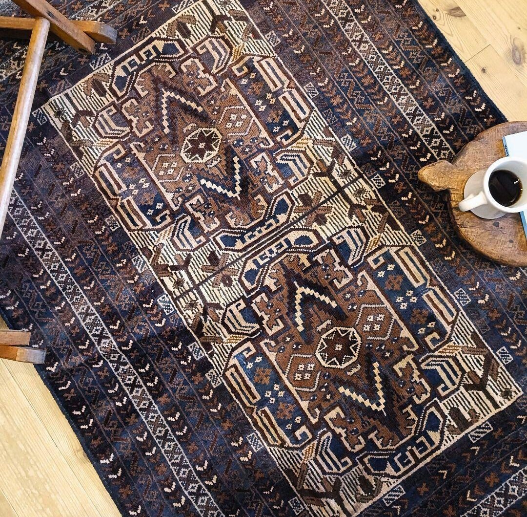 ダークネイビーからダスティラベンダーをベースにココアブラウンやアイボリーの模様がびっしりと敷きつめられたバルーチらしいデザインで、他の人とかぶらないデザインのラグをお探しの方にオススメの1枚です。