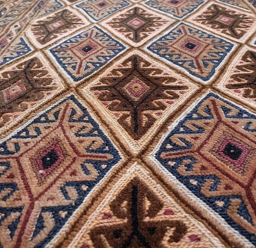 複雑で高度な“スマック織り”という技法で、毛足がなく麻のような手触りのキリム部分と、パイル地の絨毯部分があわさるため全体的に凹凸が生まれ、非常に踏み心地がよく仕上がっております。