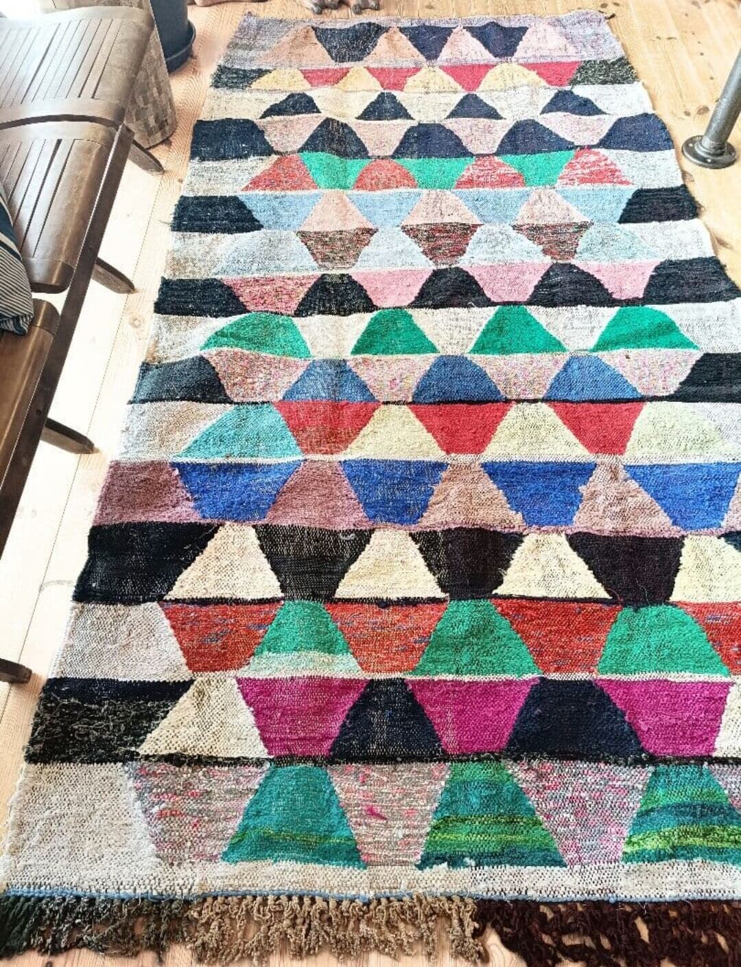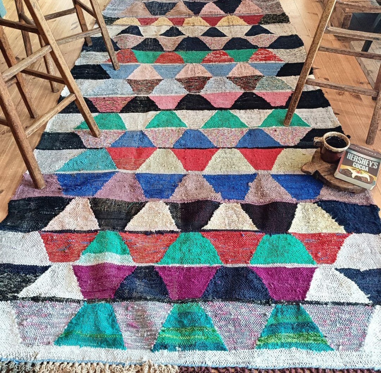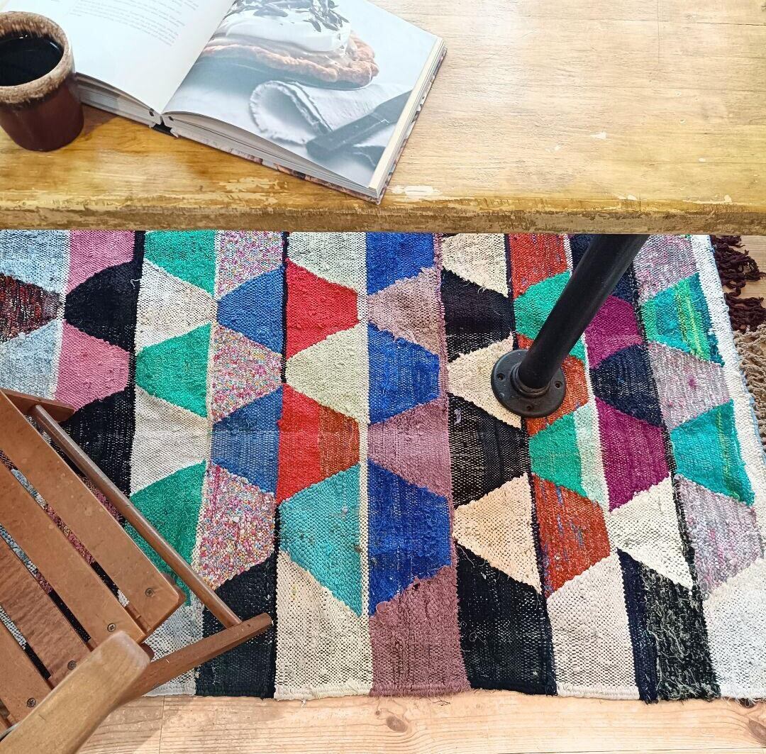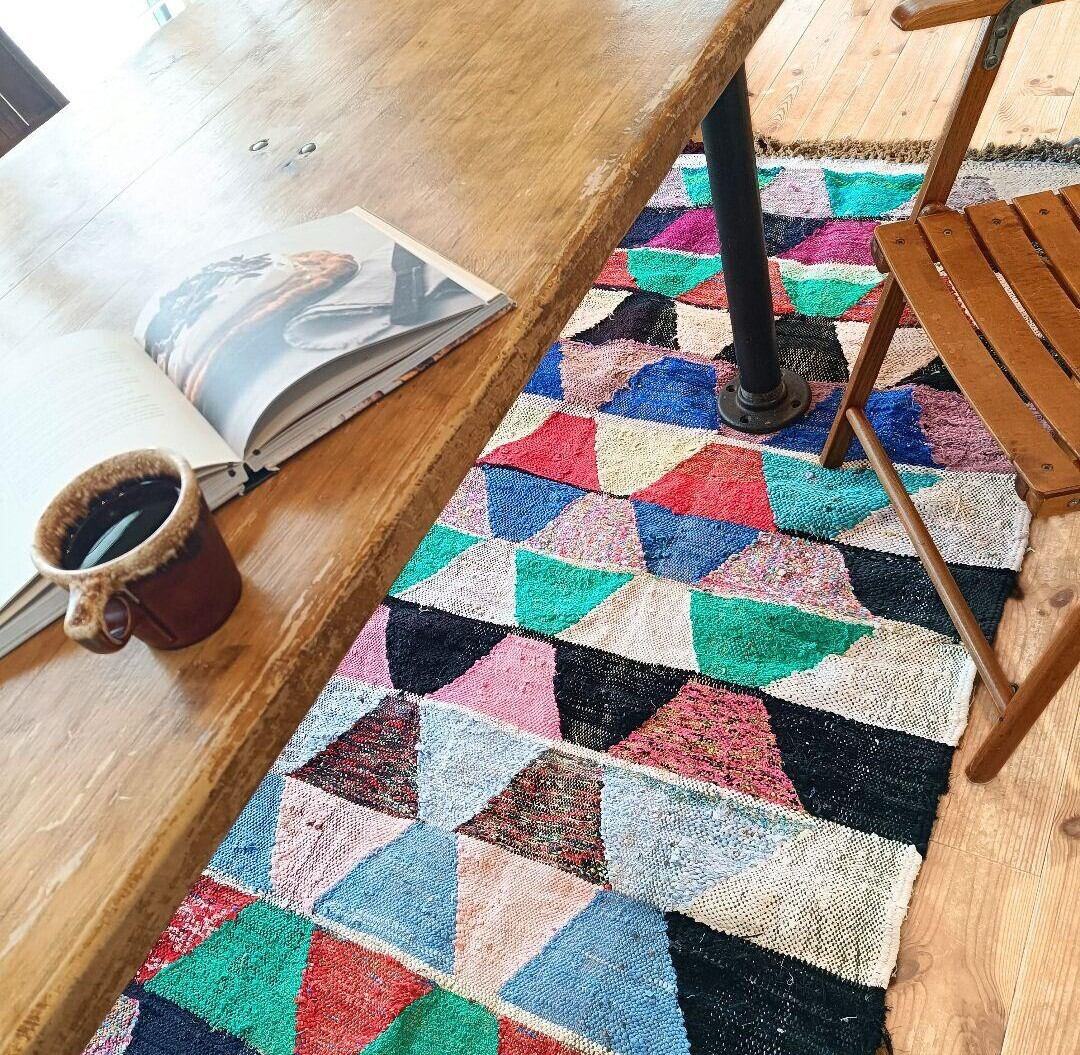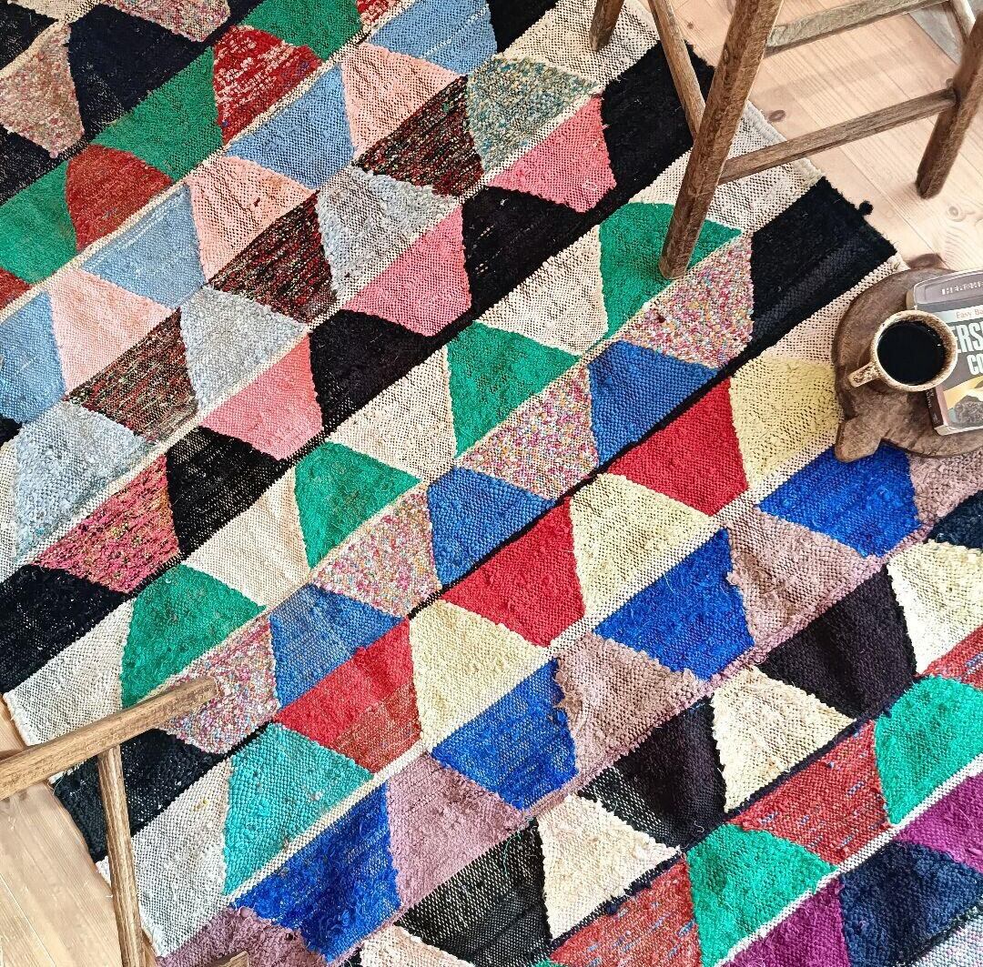 ベルベル民族の女性が、古い衣服やはぎれを使って織るボシャルウィットラグ。