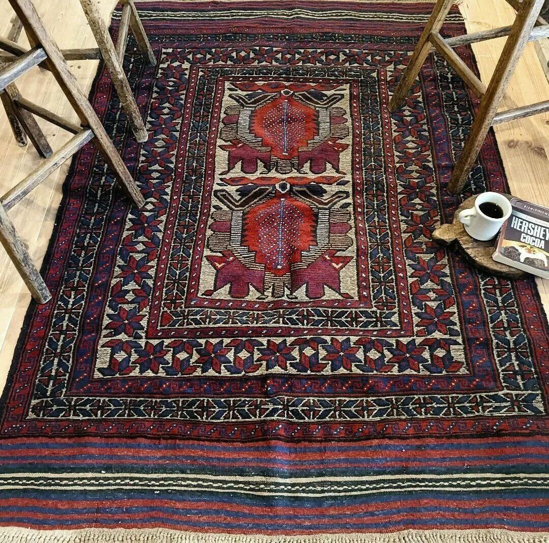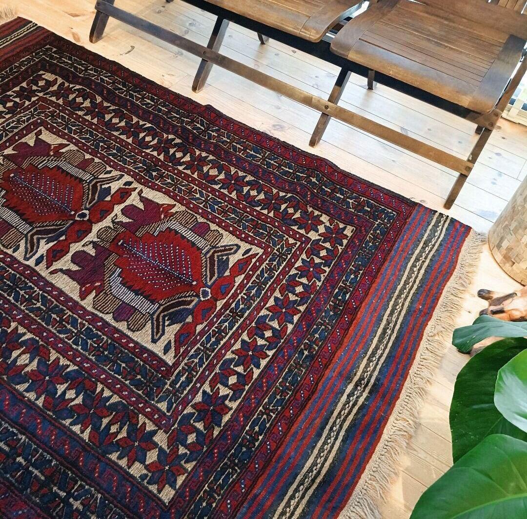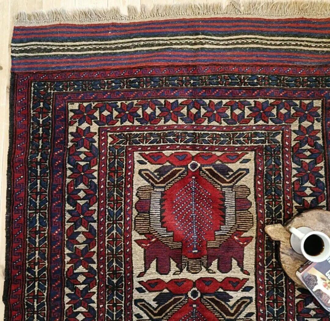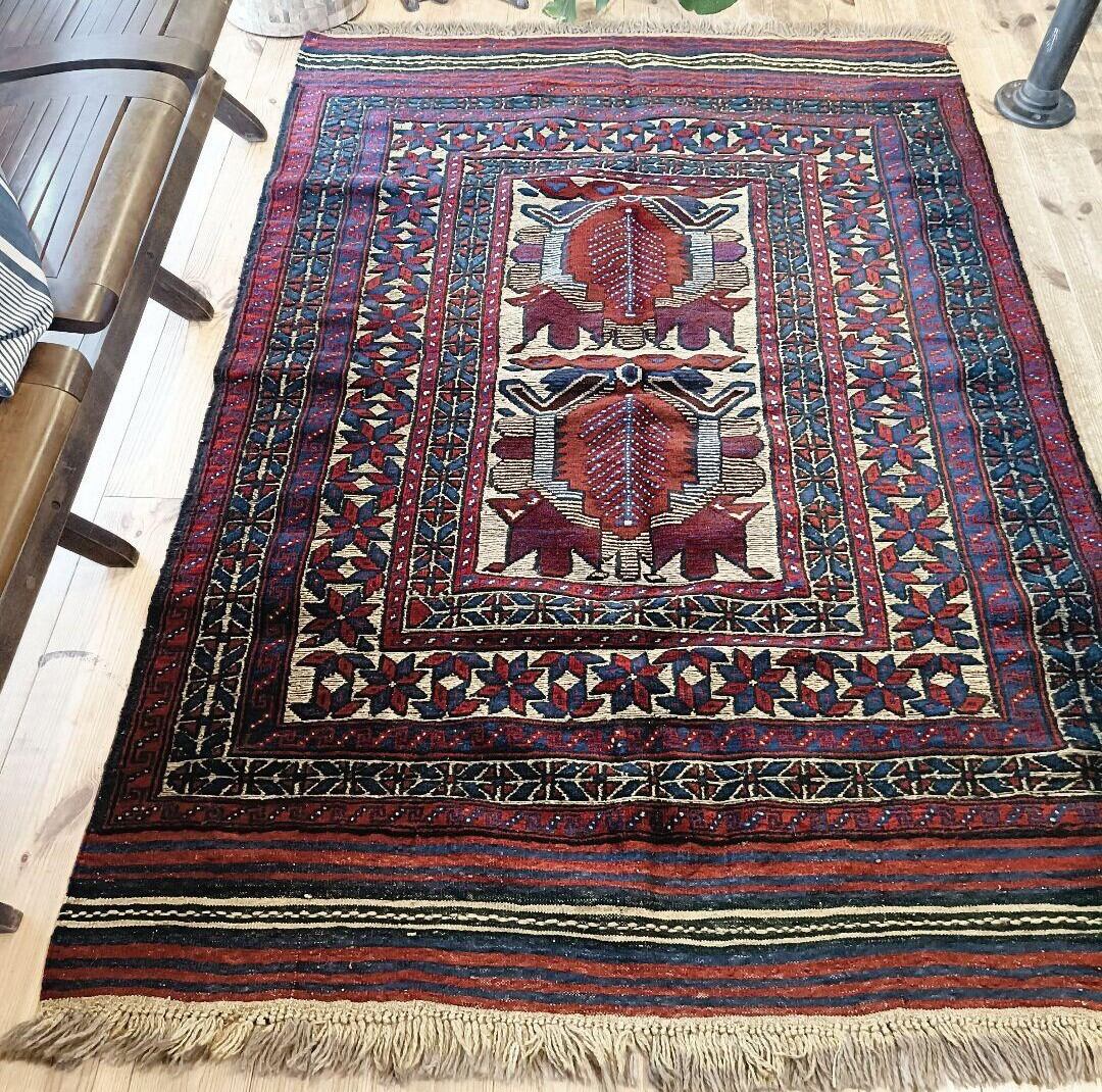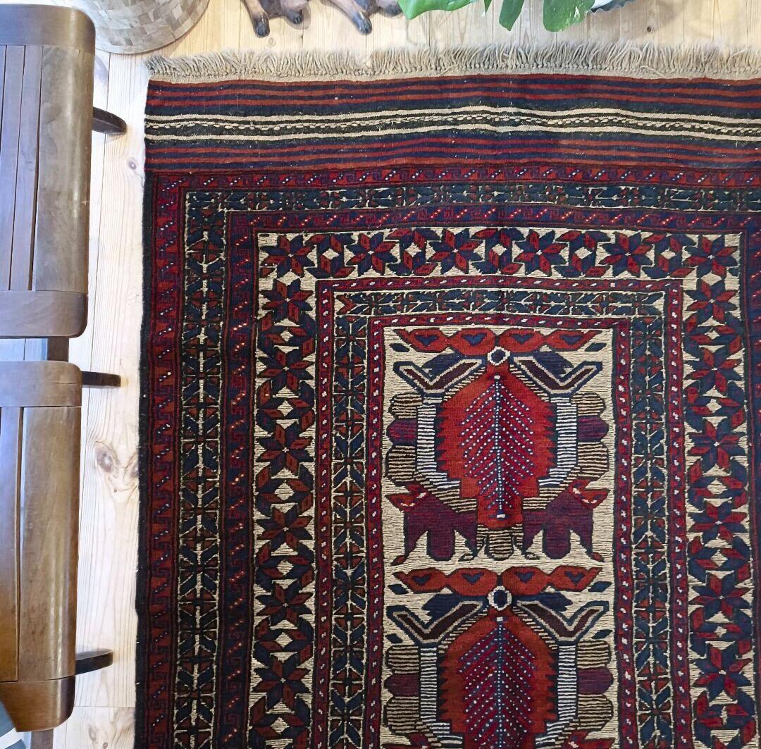 中央には生命の樹と守護動物のモチーフ、周囲には命の循環を意味する花模様がデザインされた守護と繁栄のラグ。ディープレッドやダークブルー、ベージュなどがベースとなる渋いカラーリングの1枚です。(若干のたわみあり。)