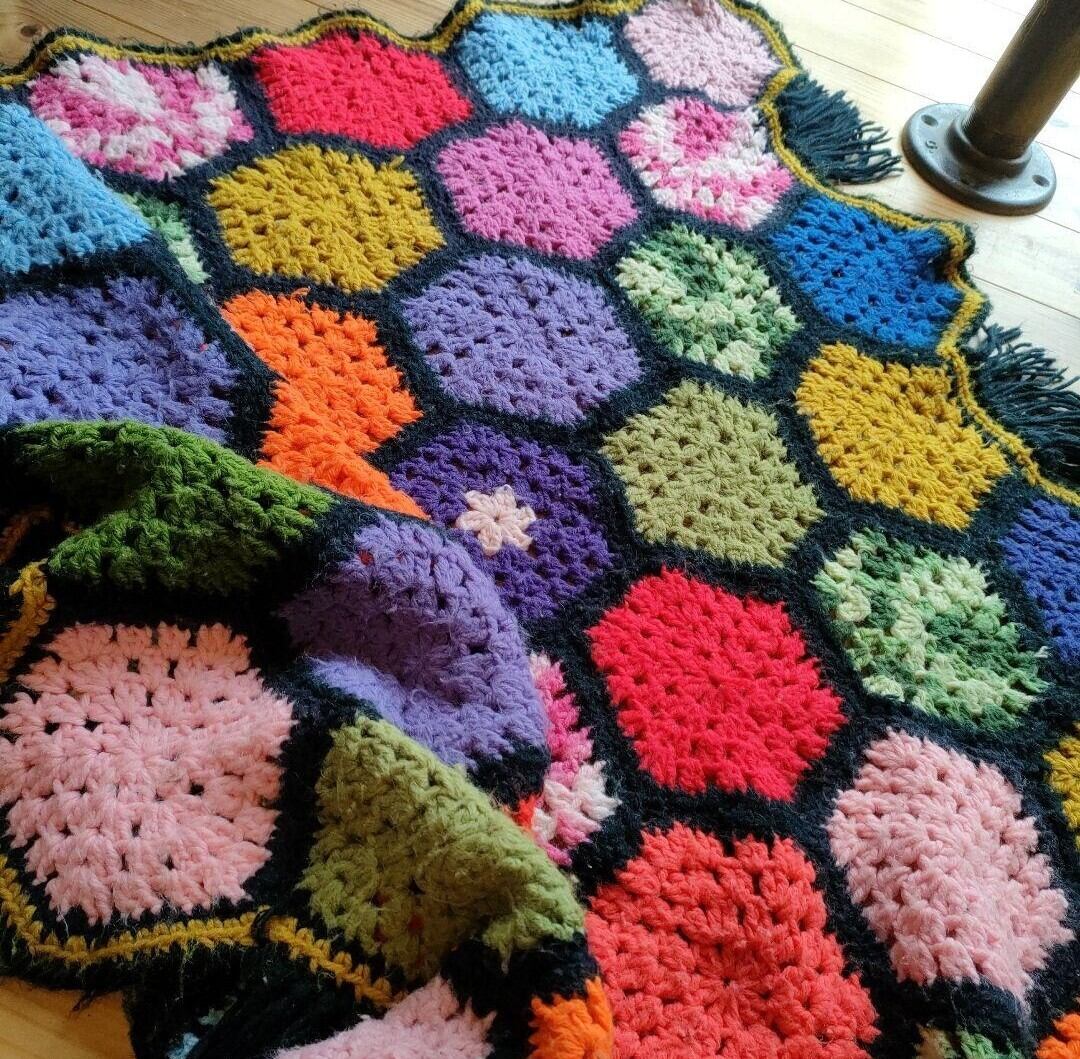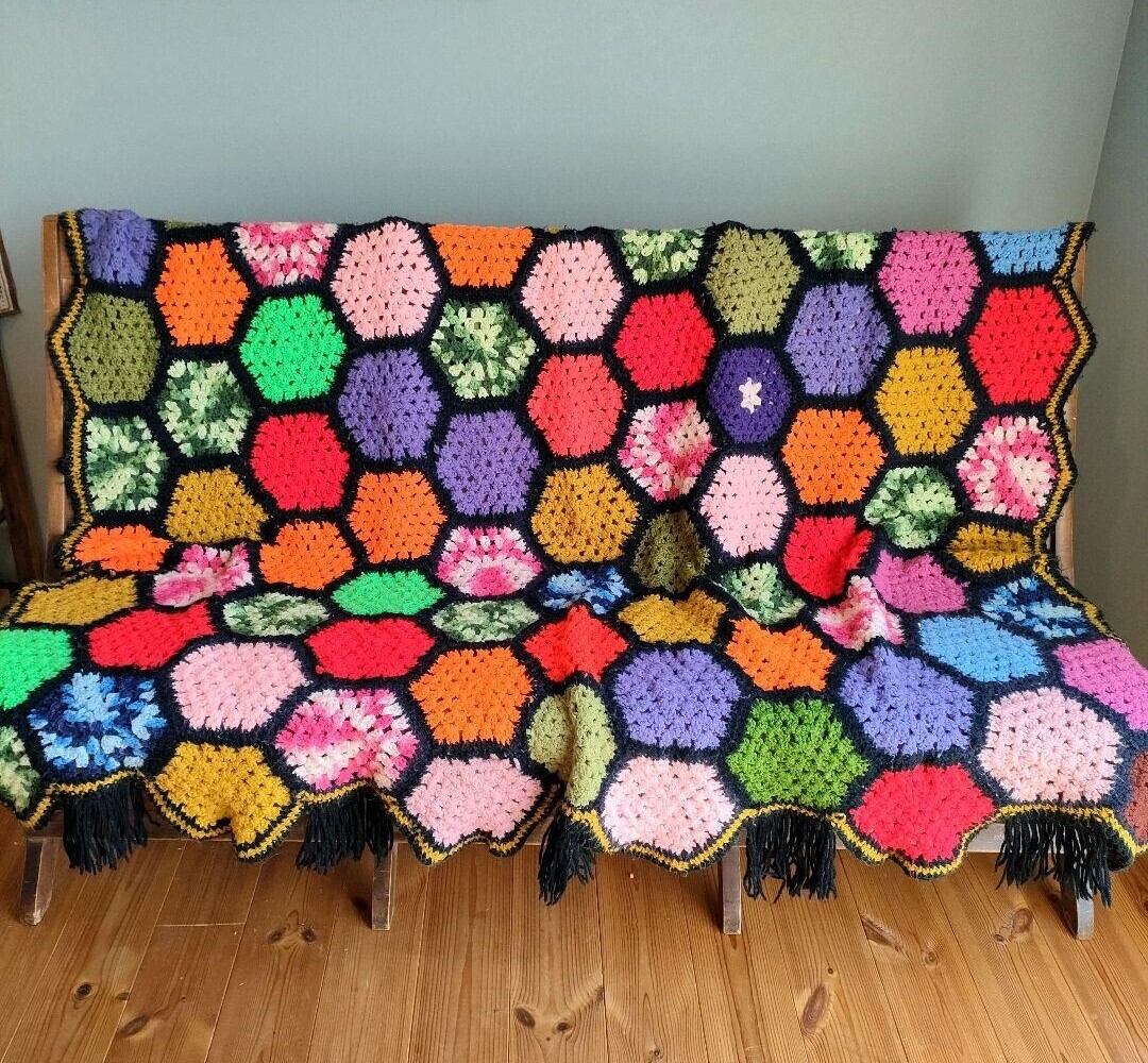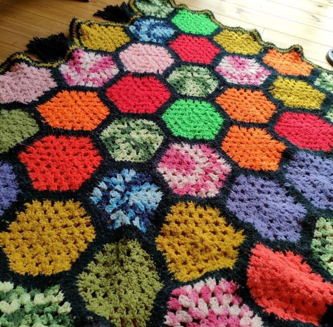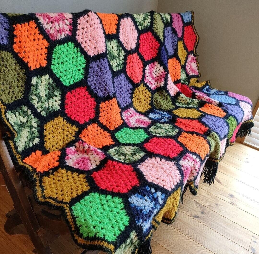 六角形を繋ぎ合わせたカラフルな一枚ですが、イエロー&ブラックのふちどりとブラックのフリンジで、引き締まった印象もあります。