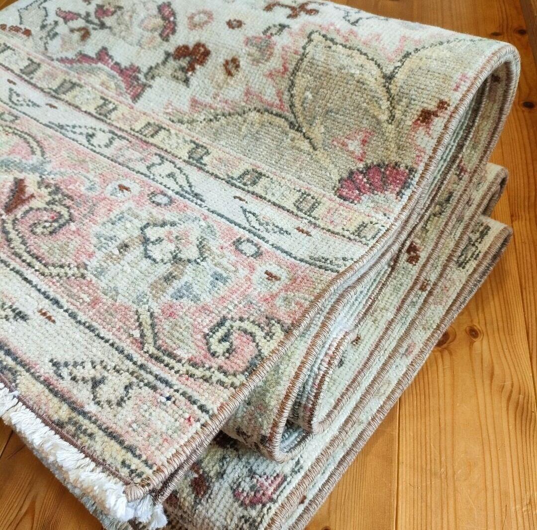 オフホワイトをベースに、淡いピンクのメダリオンと、ブルーグレーやベージュグレー、ブラウンの模様の数々が非常に美しい一枚です。