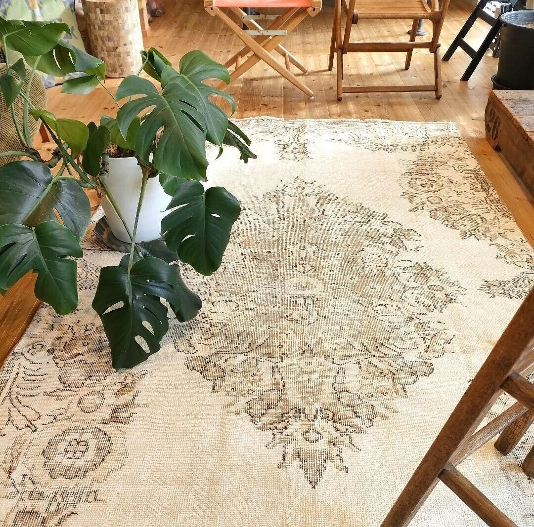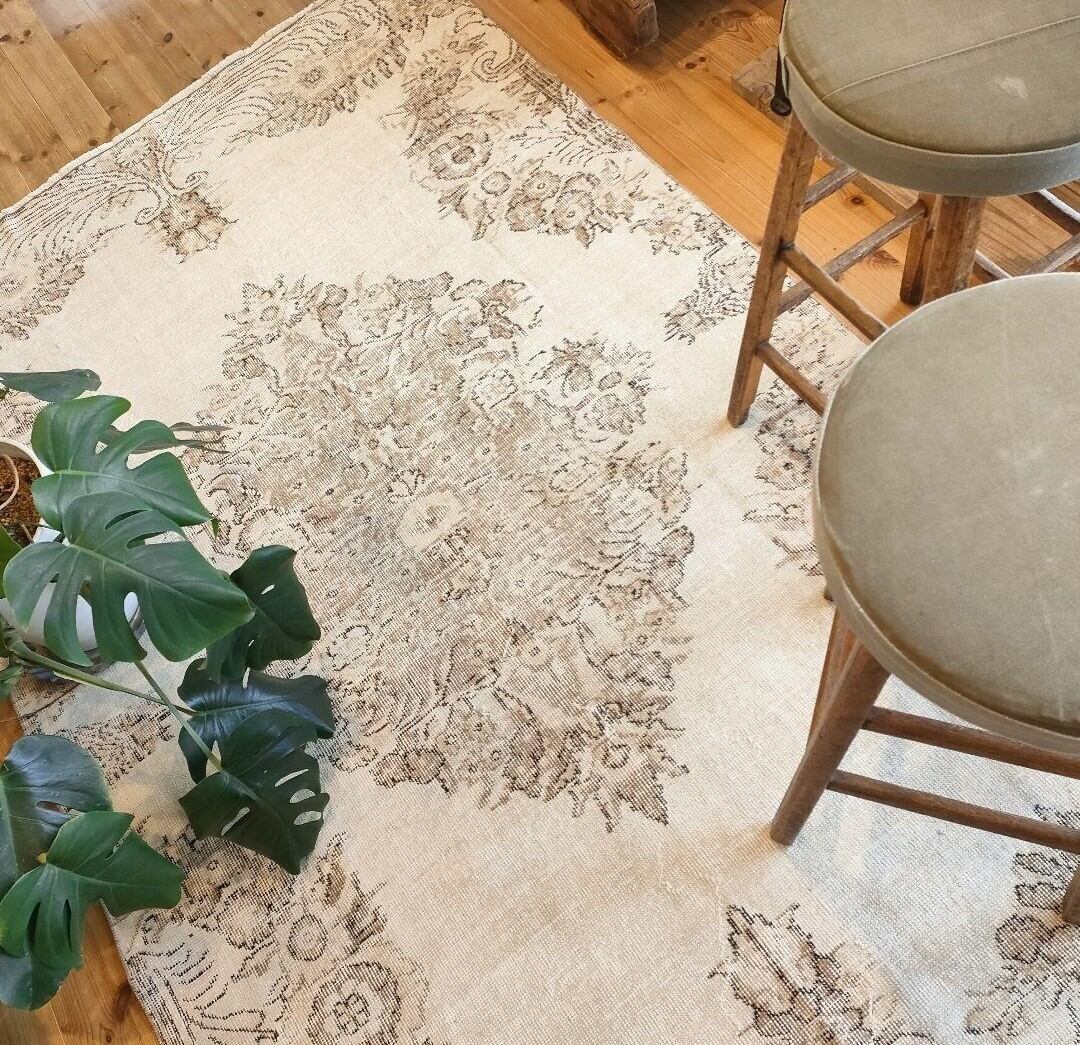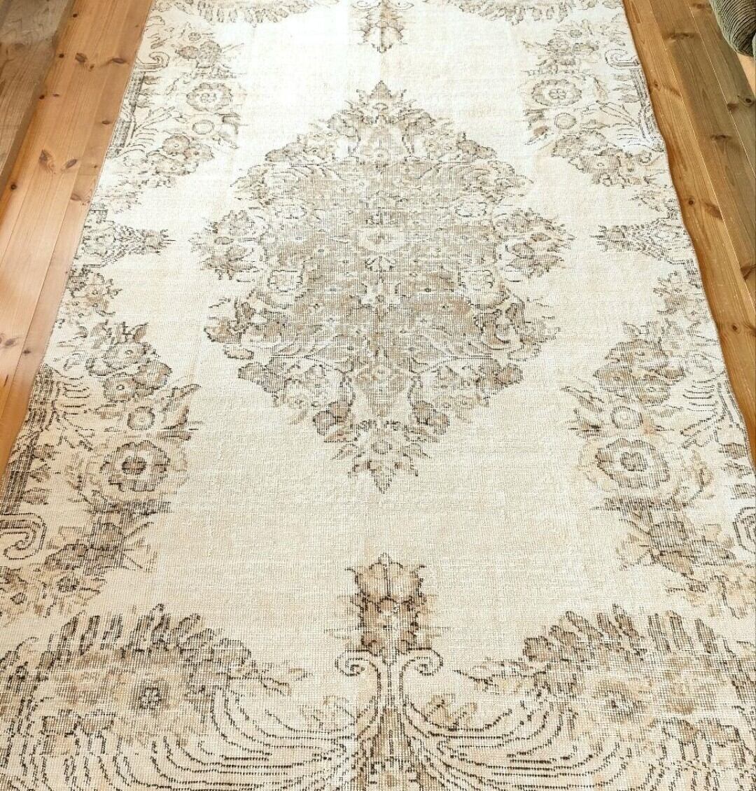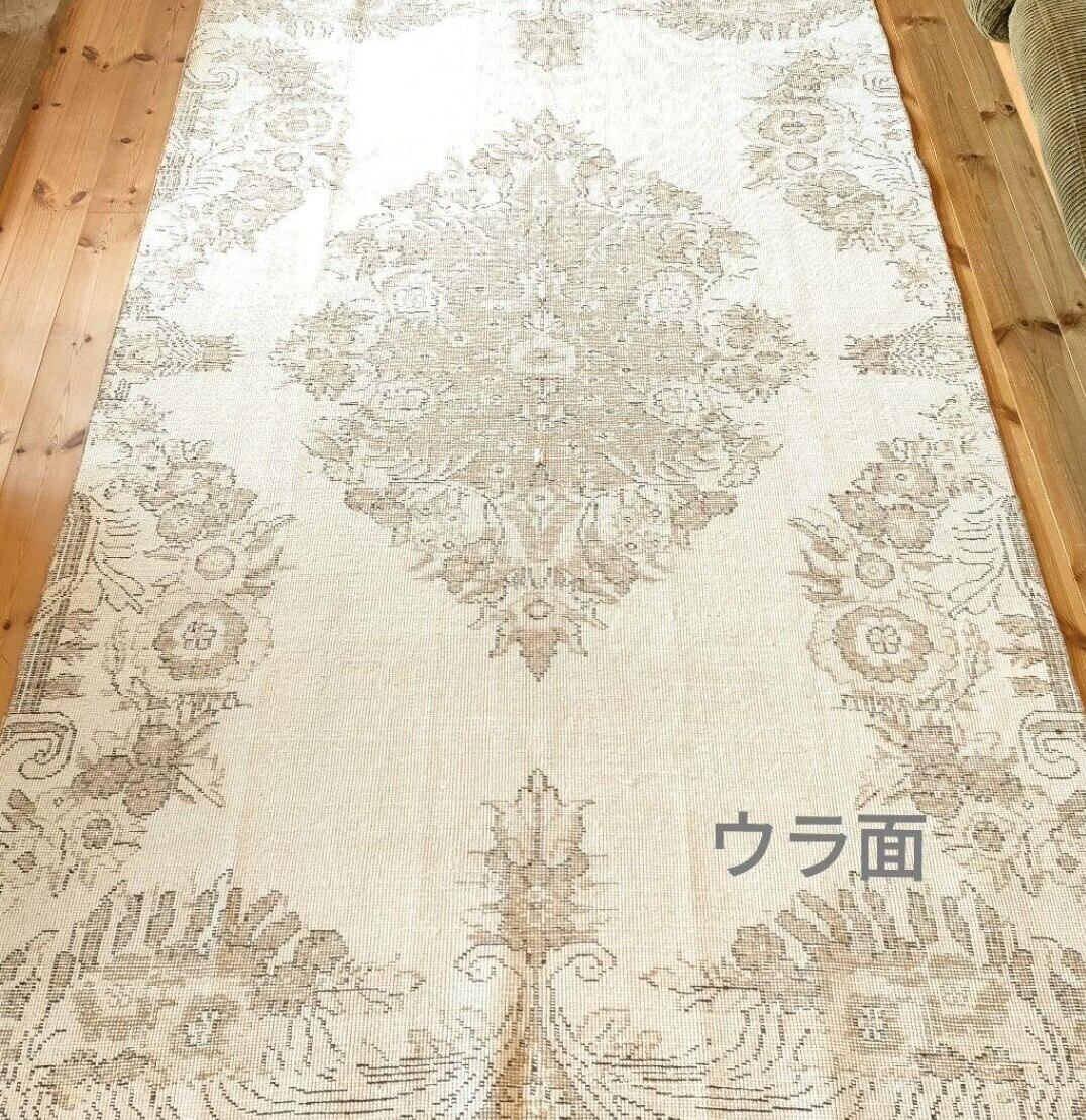 人気が高まっている、トルコ製ヴィンテージラグ。ホワイトに近いベージュをベースに、薄いブラウンのメダリオンが美しい一枚です。