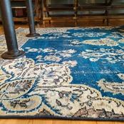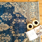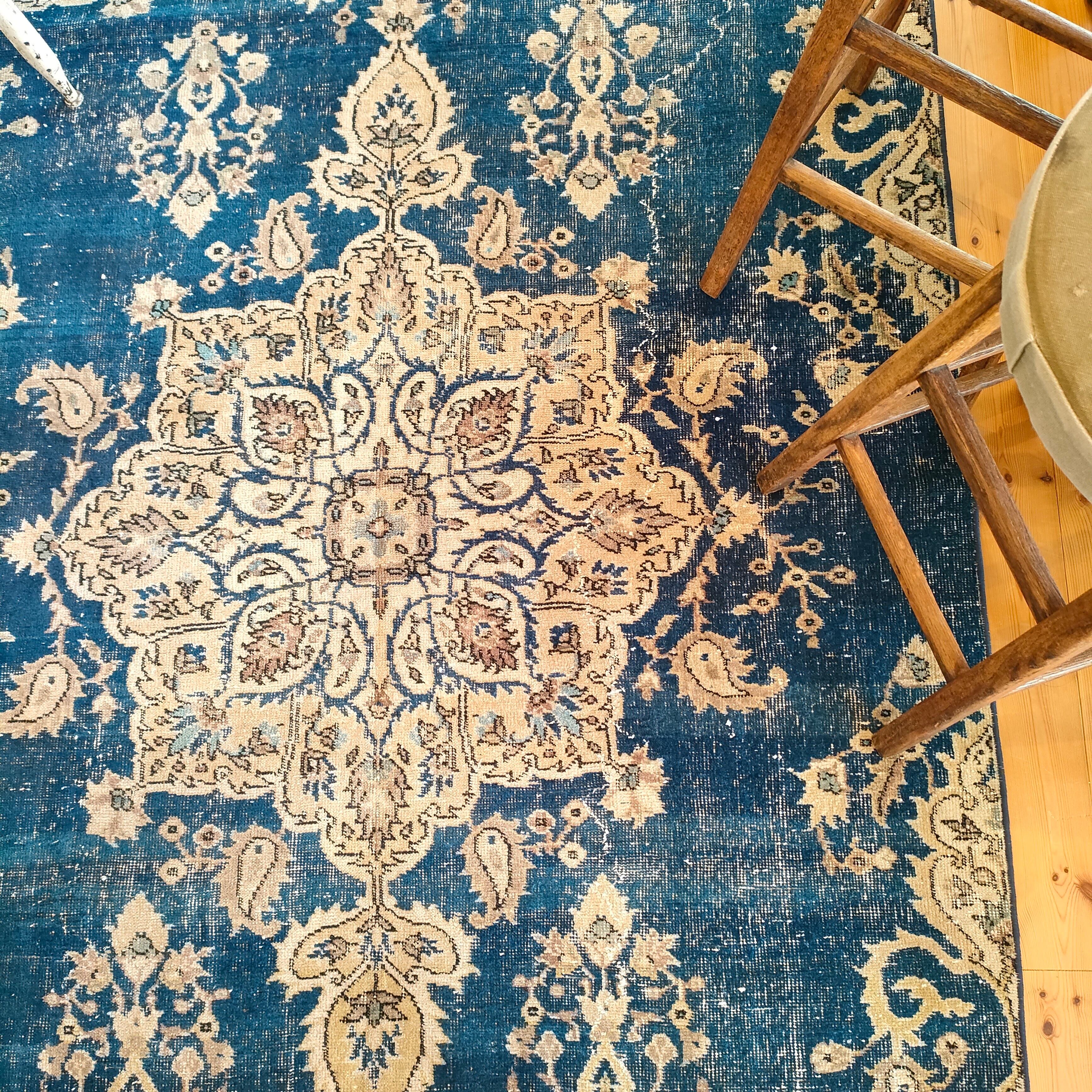 ネイビー〜ミッドナイトブルーをベースに、ベージュのメダリオンと、淡いカーキ〜ダックグリーン、ココアブラウンの模様の数々が非常に美しい一枚です。