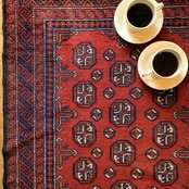 落ち着いた赤に、ギュル(家紋)が連なる伝統的なデザインで、ギュルの中心のターコイズグリーンがアクセントとなっている1枚です。
