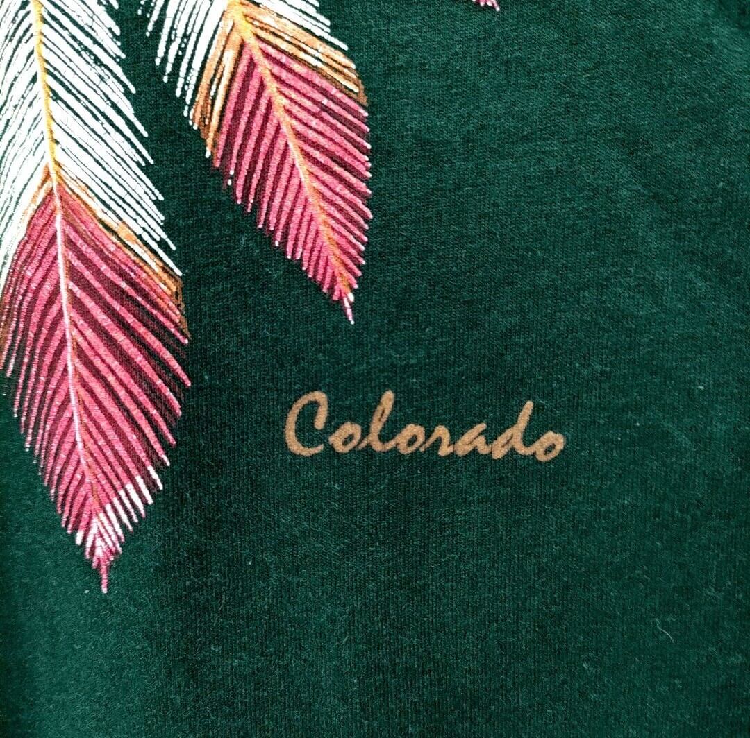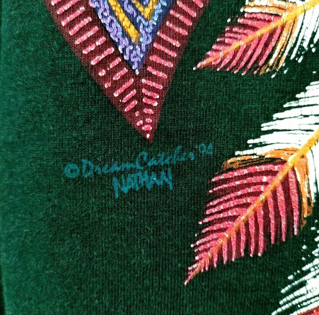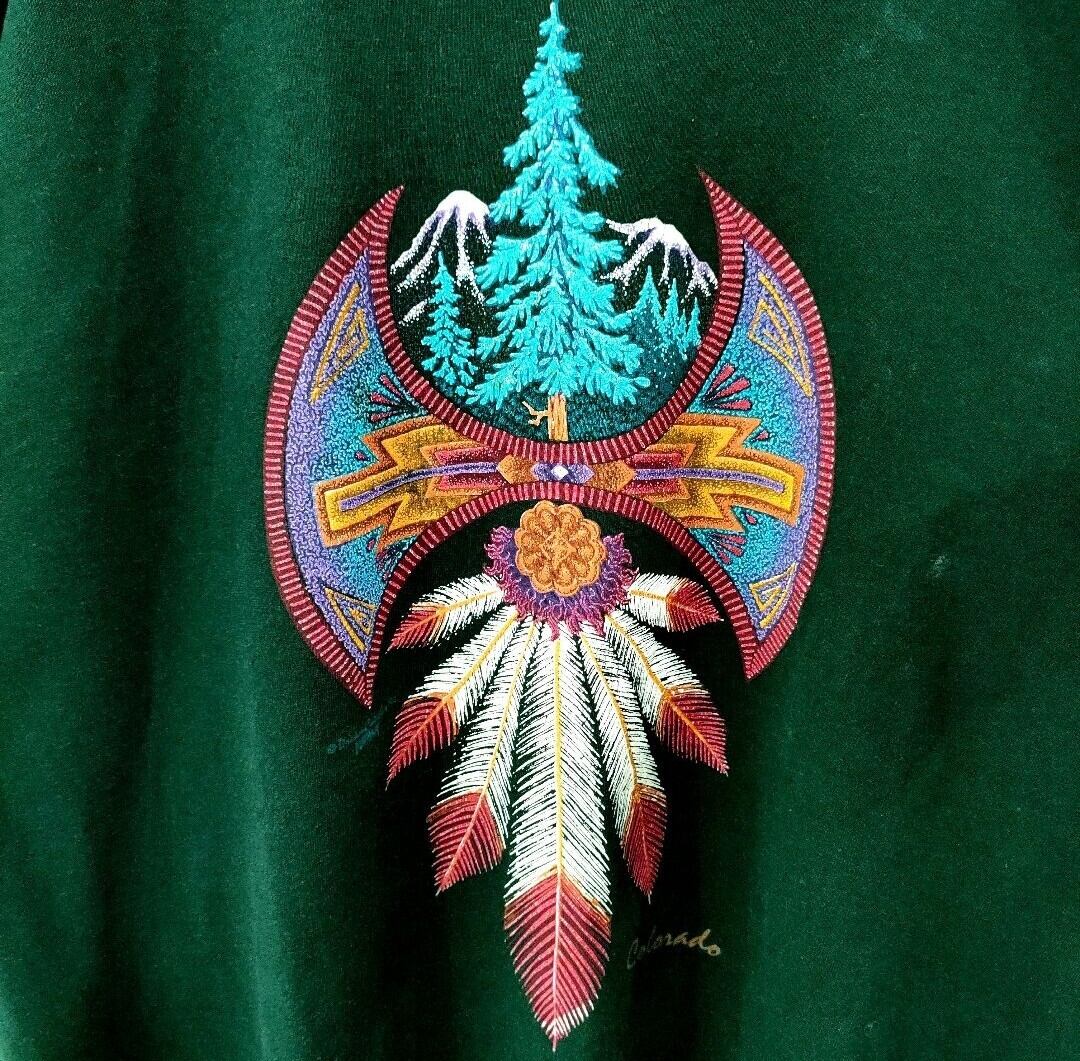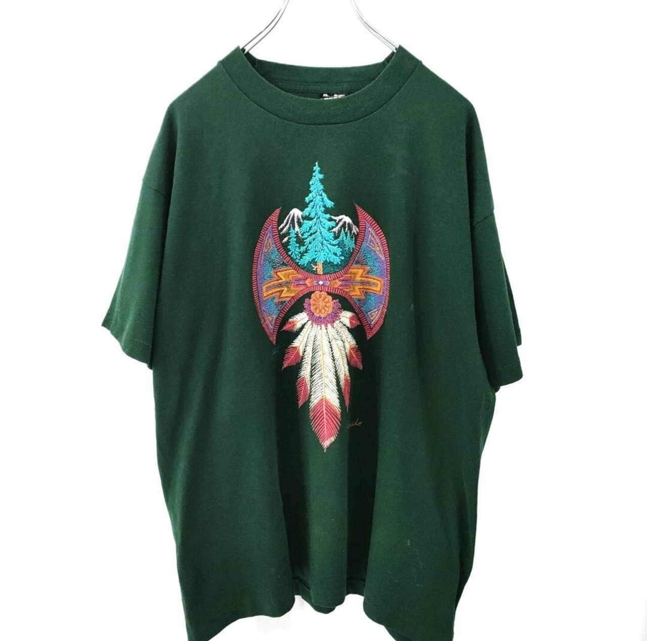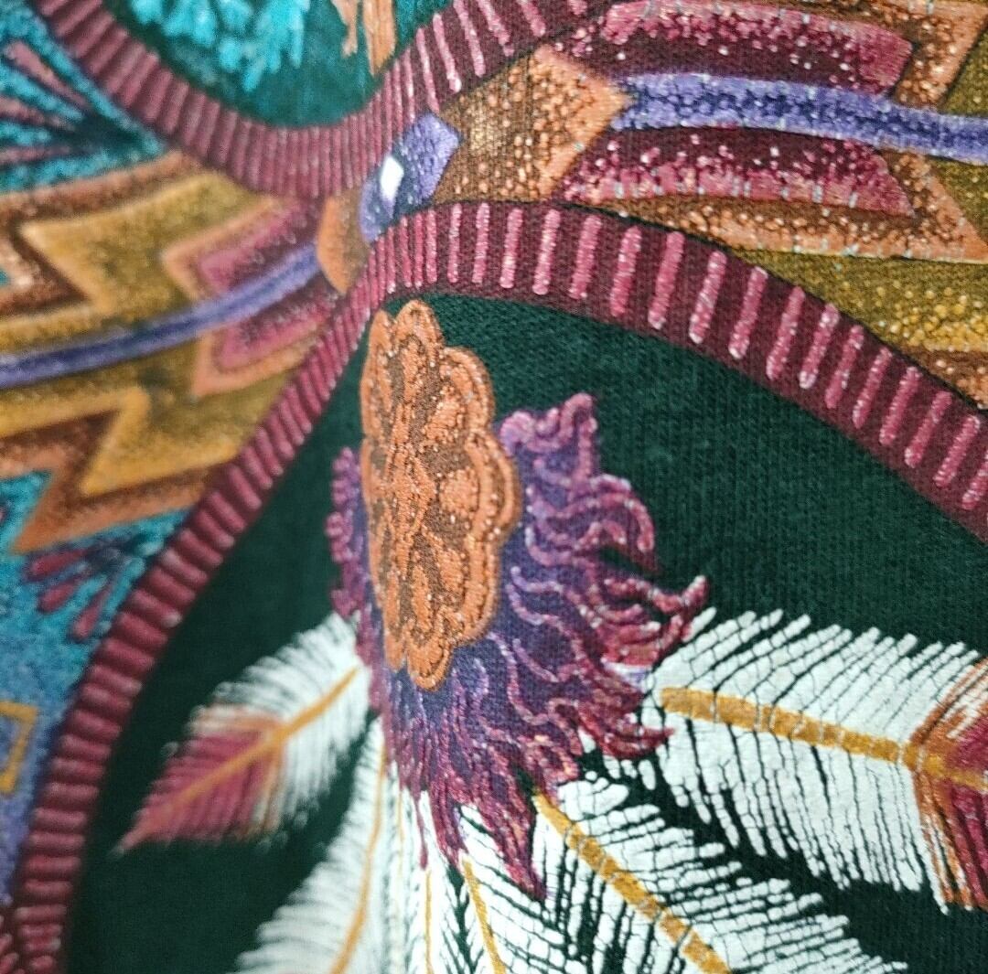 人気のFRUITS OF THE LOOMのボディーにネイティブ柄のプリント。こちらはベースのプリントの上に発泡プリントが重ねられているため、触ると立体感があるレアなデザインです。