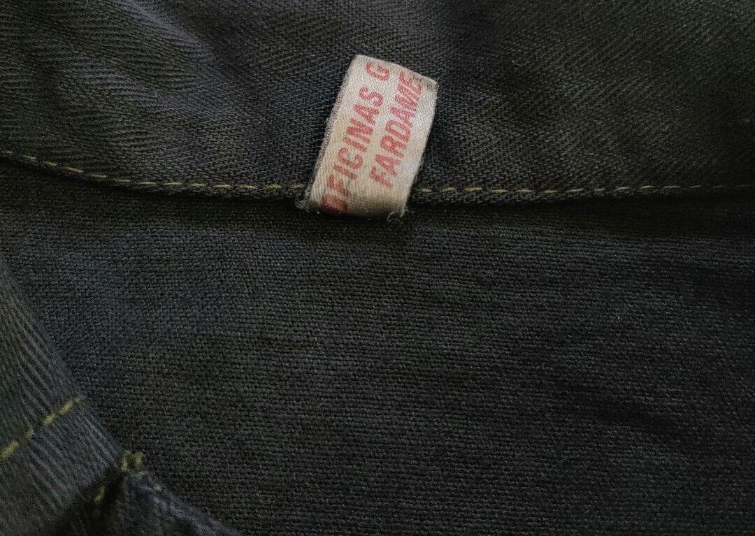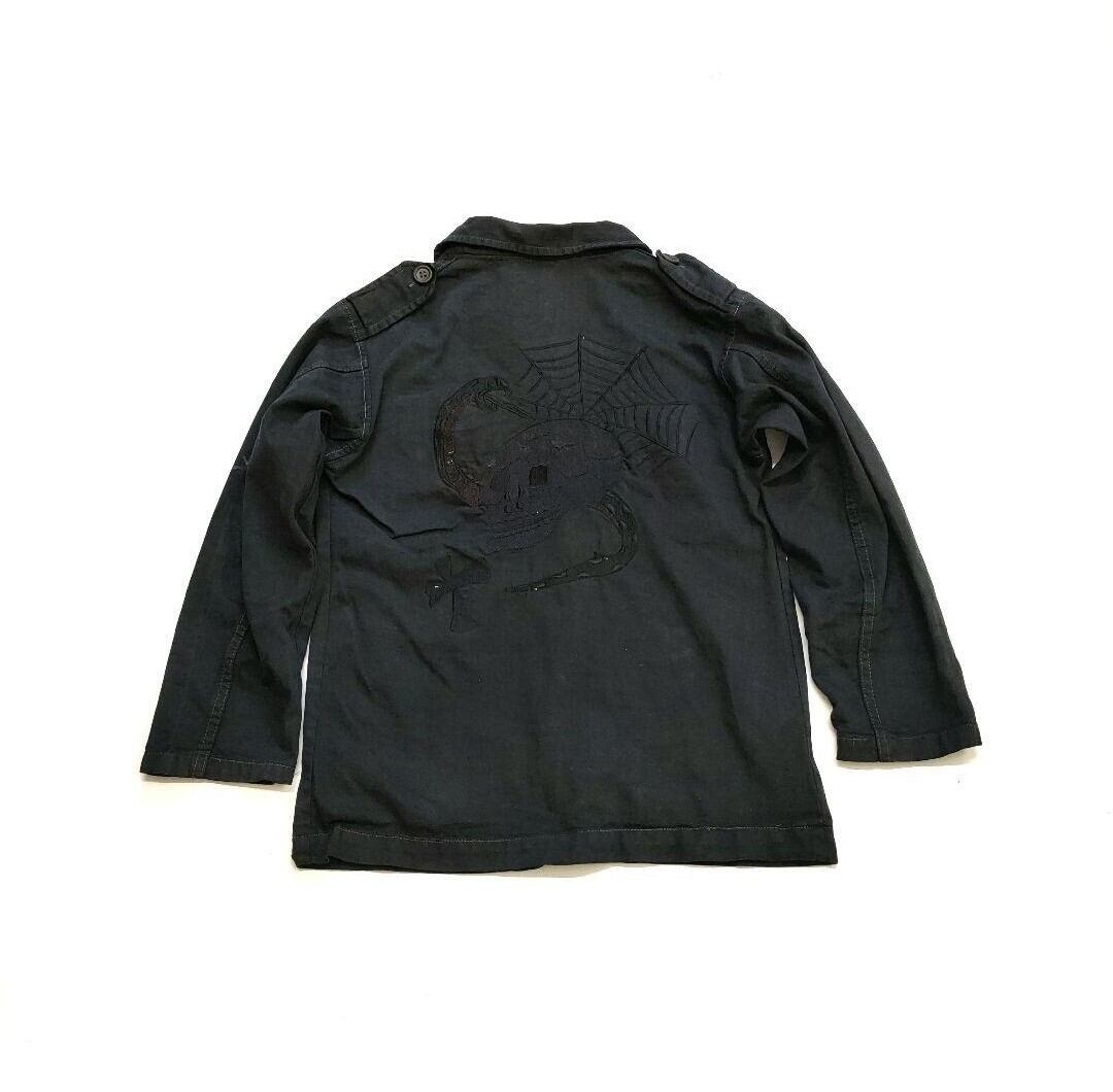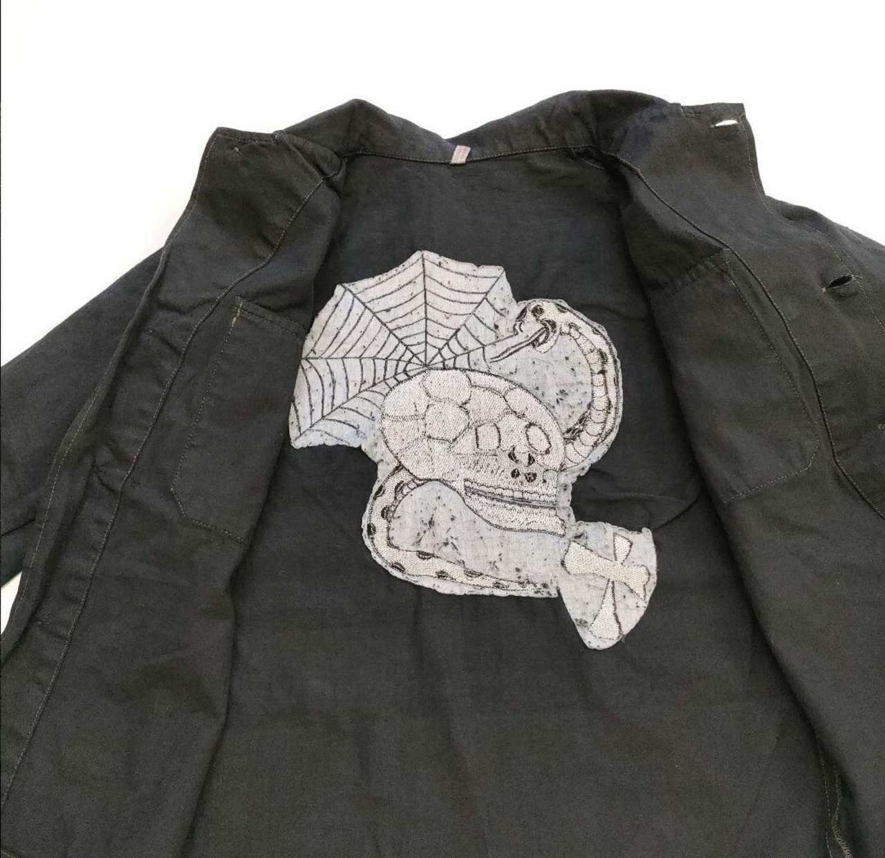 黒染めのポルトガル軍ヘリンボーンシャツに、スカルとスネークの刺繍が施された、唯一無二のシャツに仕上がっています。