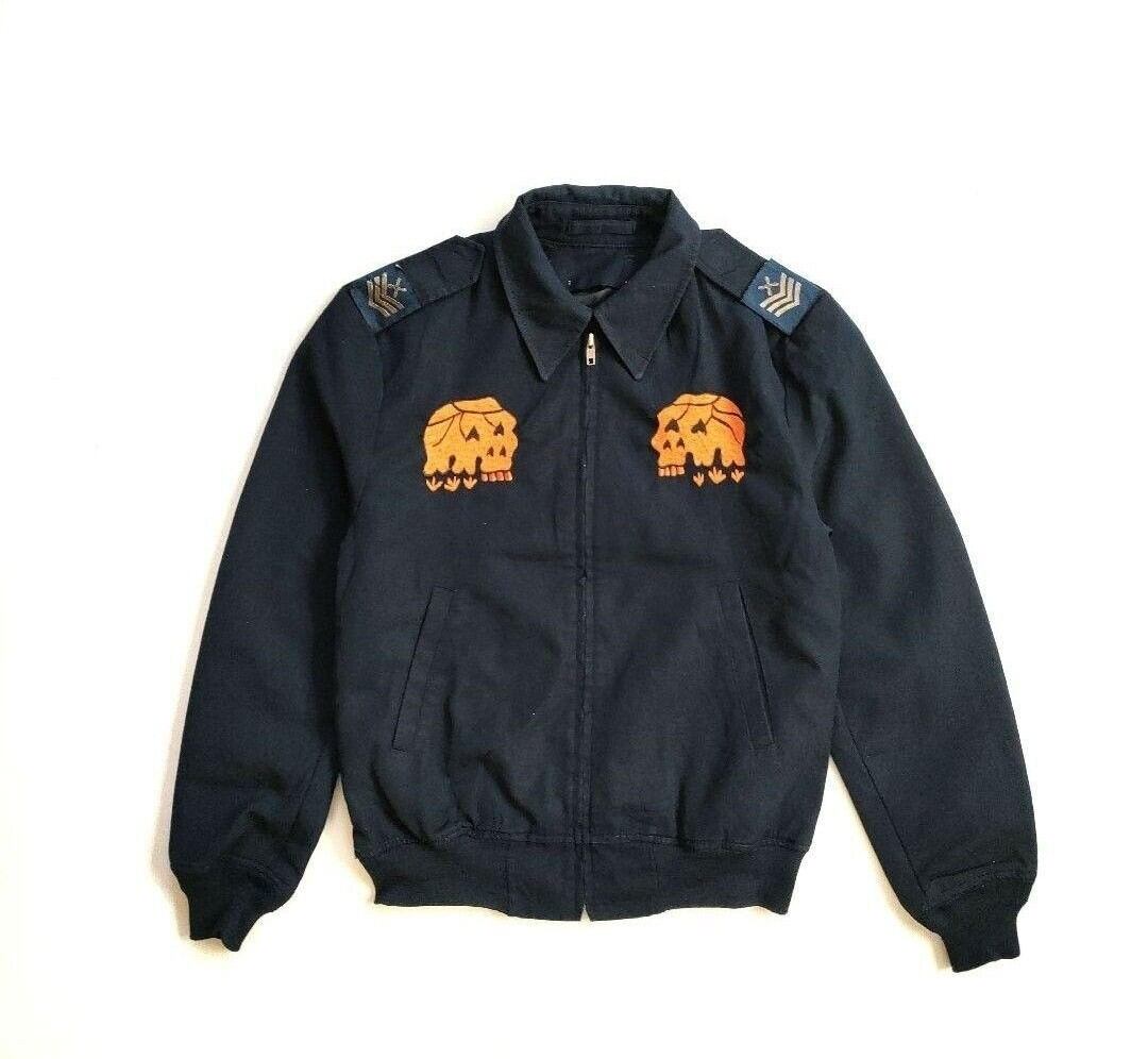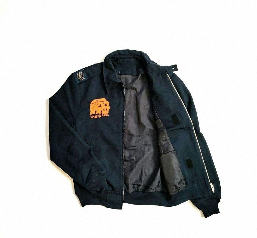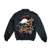 ダークネイビーのジャケットをベースに、バックには大胆な日本地図と富士山、フロントにはオレンジのスカルが刺繍され、リッチな一点ものに仕上がっています。