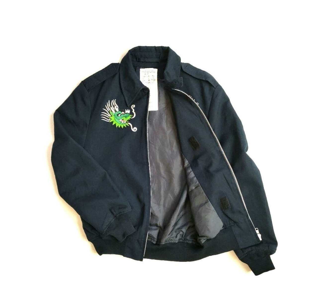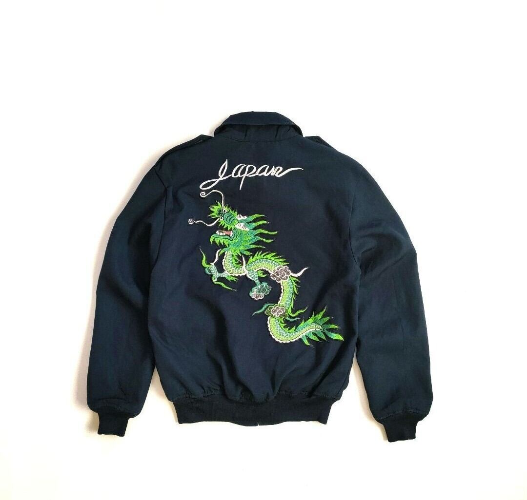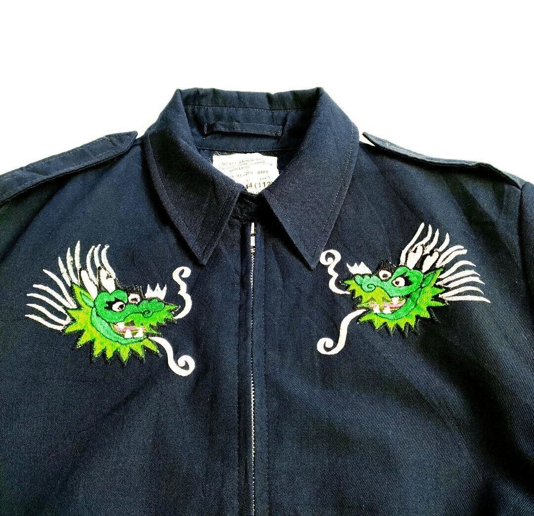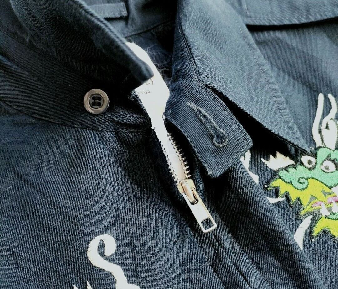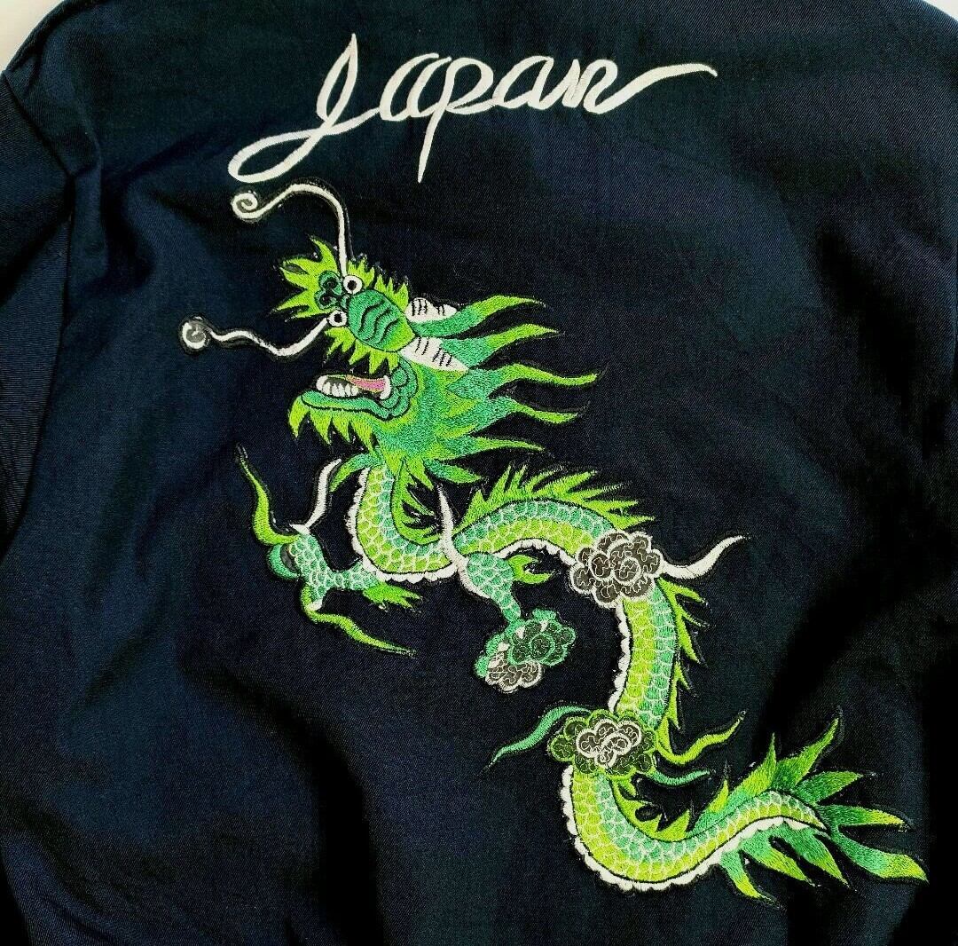 ダークネイビーのジャケットをベースに、バックには大胆な龍が刺繍され、リッチな一点ものに仕上がっています。