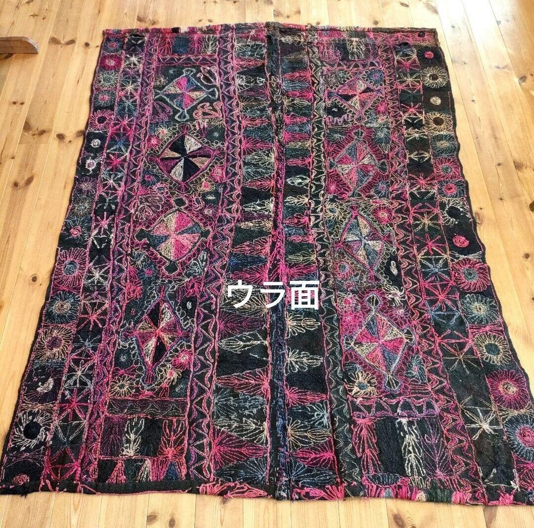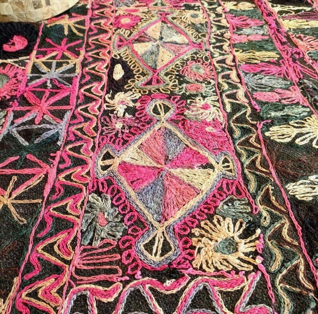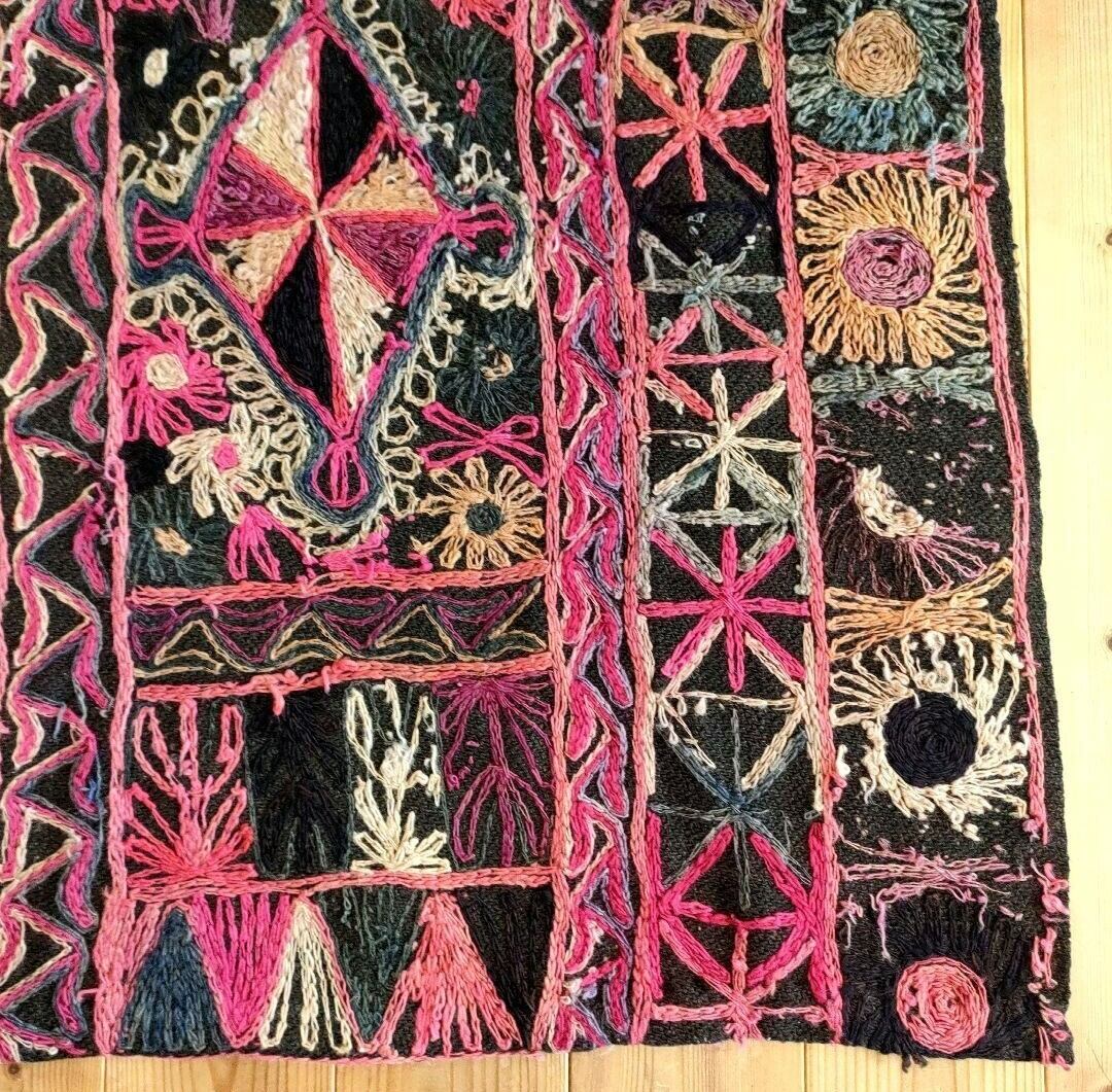 褪せたブラックをベースに(一部布の継ぎあり。)、ビビットピンクやベージュ、バイオレットなどカラフルな糸で数々のモチーフが刺繍が施されています。