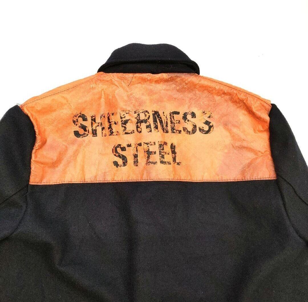 黒とオレンジの配色、背面に「SHEERNESS STEEL」のプリントが施されたドンキーコートとなります。