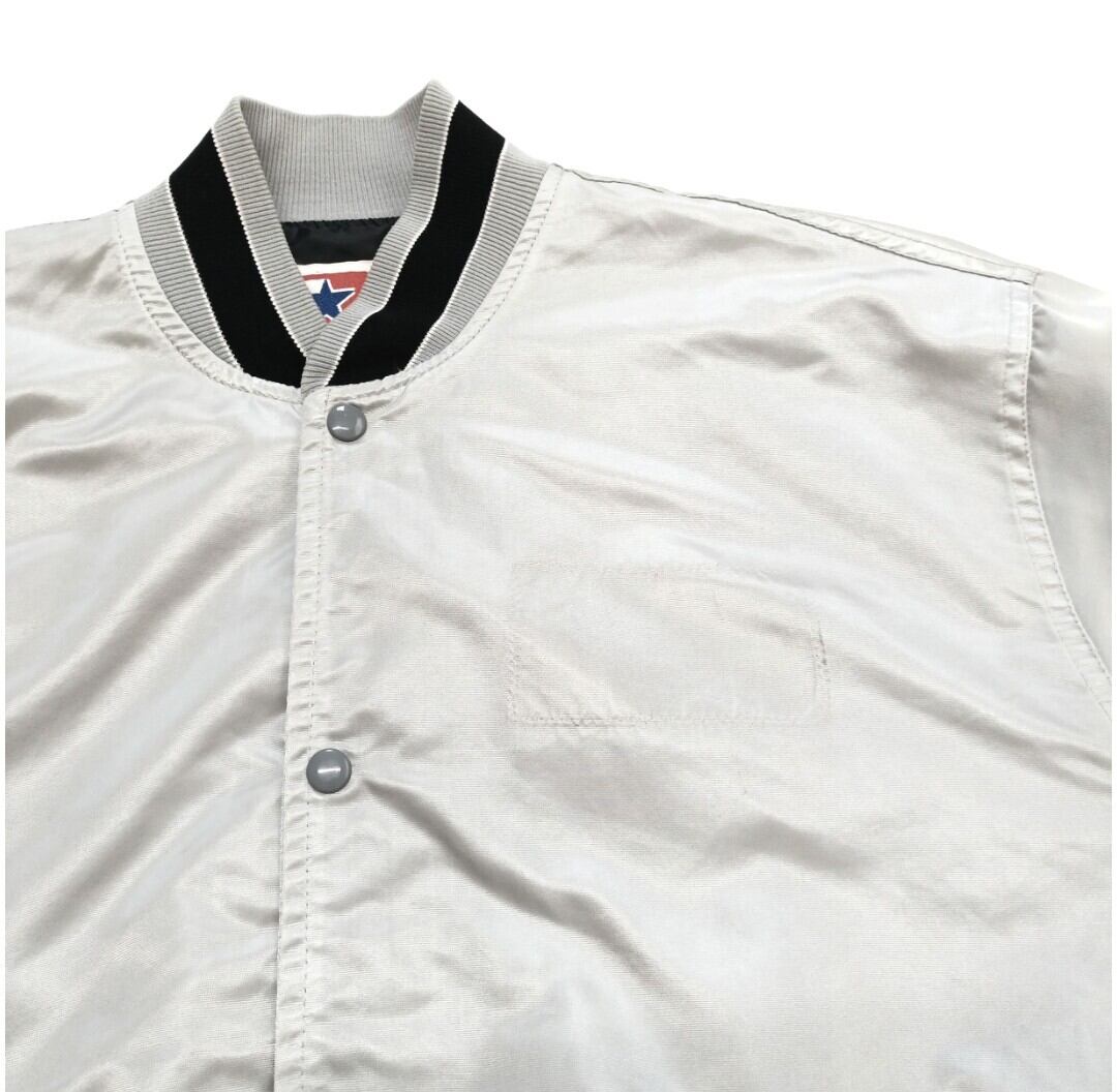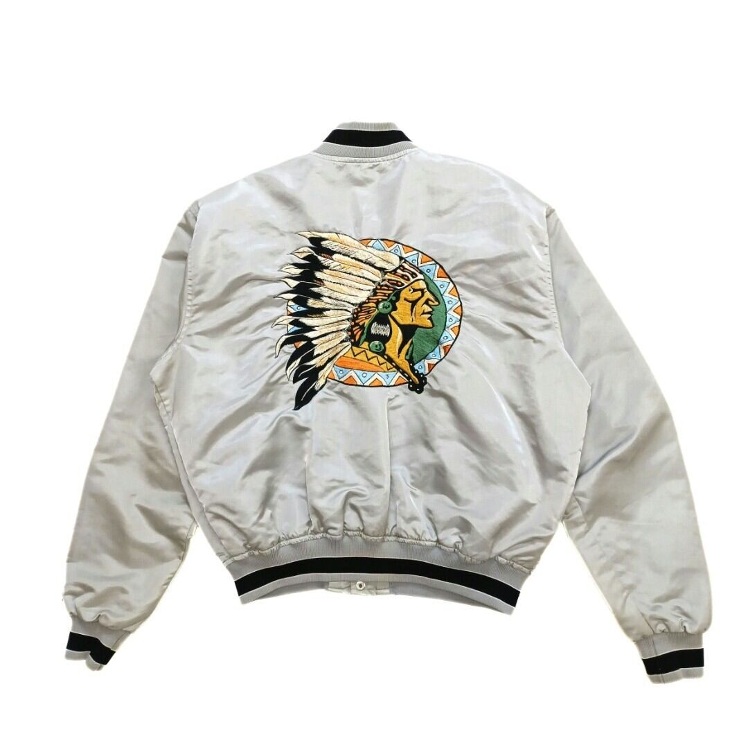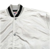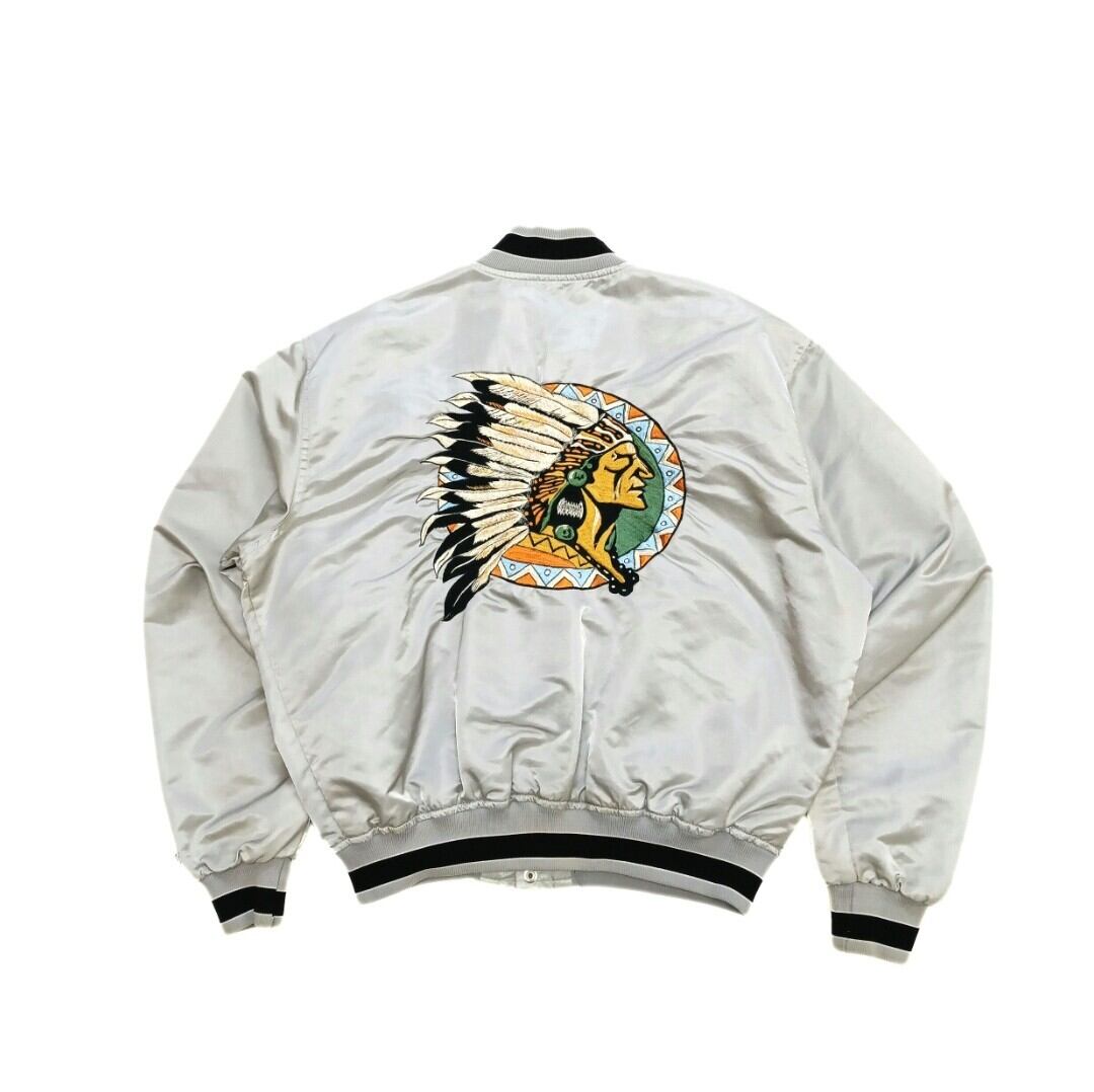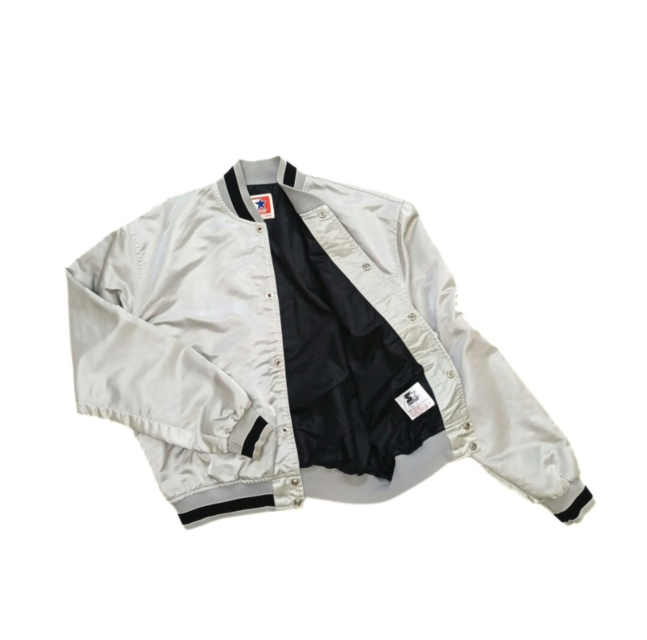 シルバーボディのバックに大きくインディアンヘッドが刺繍された、STARTER スターターのナイロンジャケットです。